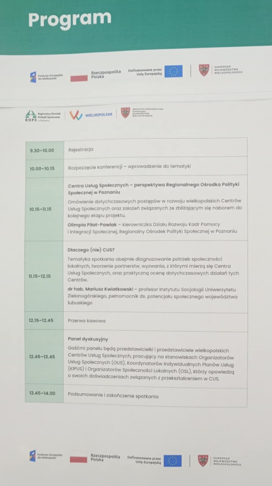 Konferencja była organizowana w ramach projektu pn. „Rozwój Wielkopolskiej Sieci Centrów Usług Społecznych” realizowanego w ramach Programu Fundusze Europejskie dla Wielkopolski 2021-2027, Działanie FEWP.06.13 Usługi społeczne i zdrowotne, współfinansowanego ze środków Unii Europejskiej w ramach Europejskiego Funduszu Społecznego Plus przez Województwo Wielkopolskie/Regionalny Ośrodek Polityki Społecznej w Poznaniu w okresie od 01.07.2023 do 30.06.2026 r