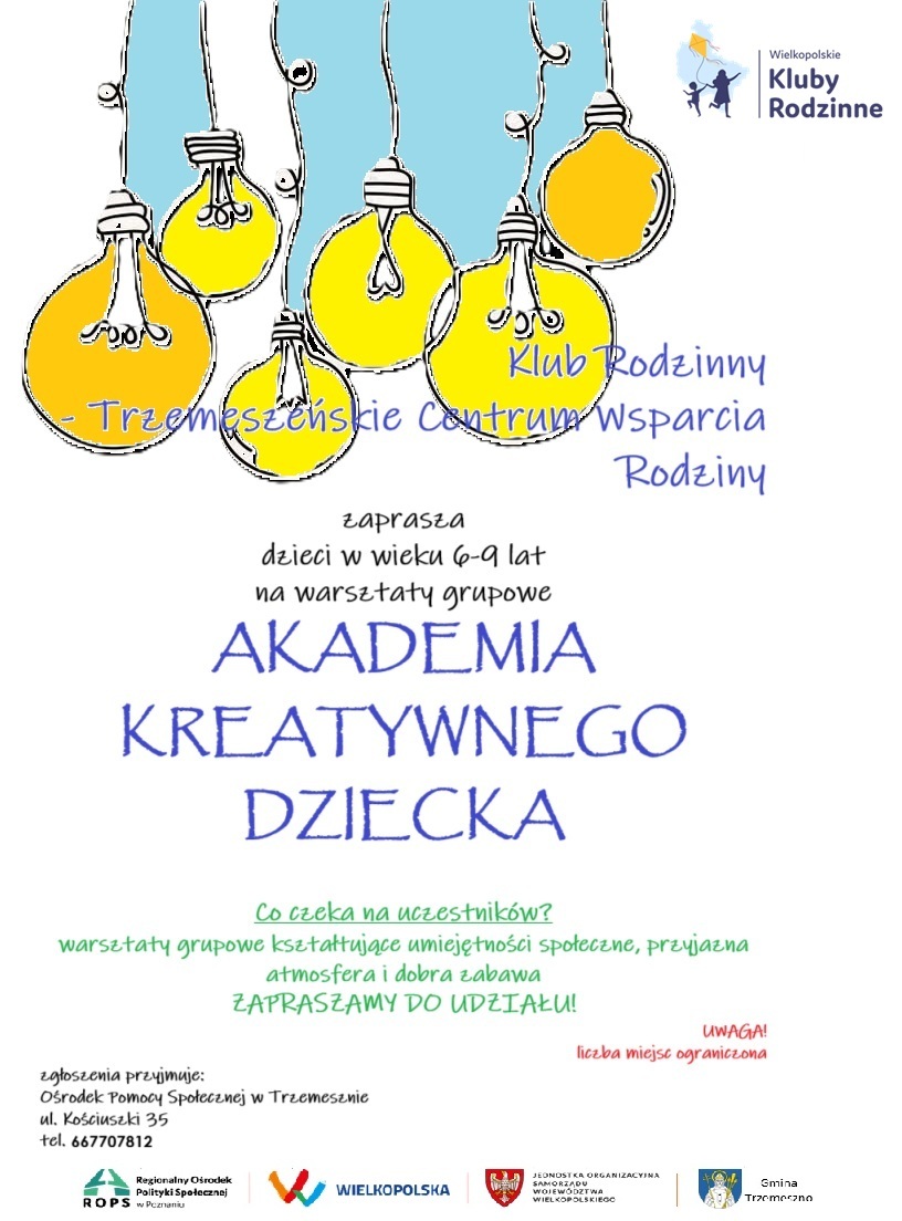 - „Akademia Kreatywnego Dziecka” warsztaty grupowe z treningu umiejętności społecznych dla dzieci w wieku od 6 do 9 roku życia. Rozwój umiejętności społecznych takich jak empatia, uważne słuchanie, współpraca w grupie, właściwa interpretacja uczuć i wiele innych.Wtorek godz. 15:15 do 17:15