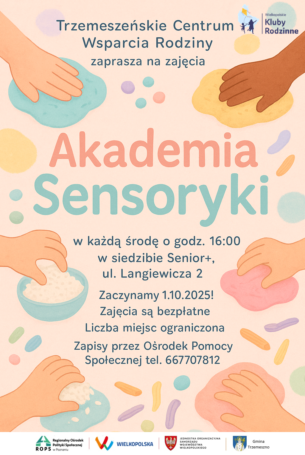 - „Akademia Sensoryki”warsztaty grupowe z elementami plastyki sensorycznej oraz zajęć ogólnorozwojowych, dla dzieci w wieku od 1 do 5 roku życia wraz z rodzicami. Zajęcia o charakterze integracyjno-rozwojowym, w szczególności rozwój zmysłów i ich integracji. Środa godz. 16:00 do 18:00.
