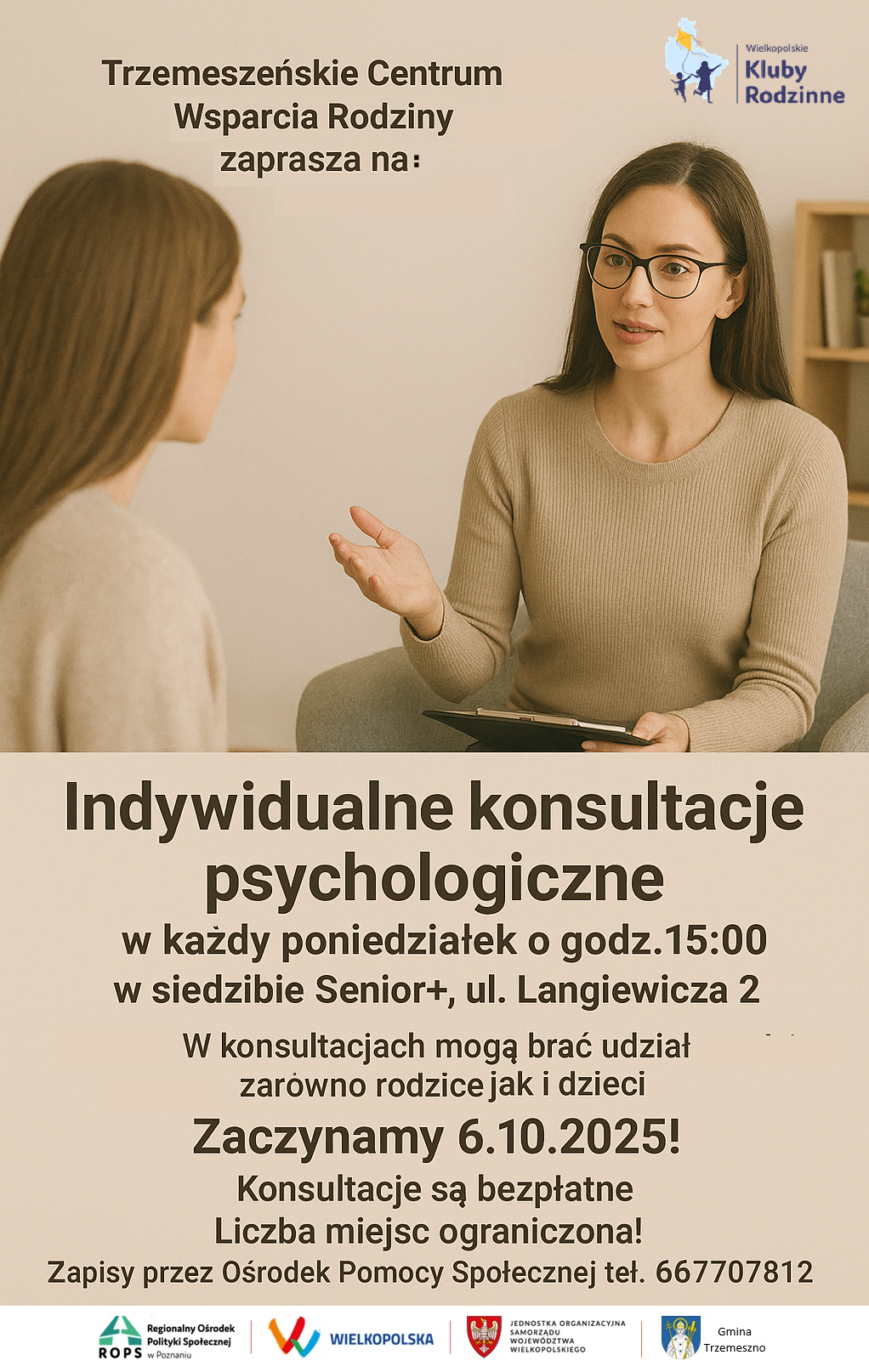 - Indywidualne konsultacje psychologiczne dla rodziców i dzieci w wieku od 4 do 18 lat. Zakres konsultacji będzie obejmował doraźną pomoc psychologiczną dla rodziców i dzieci wymagających interwencji psychologicznej. Każdy poniedziałek od godz. 15:00