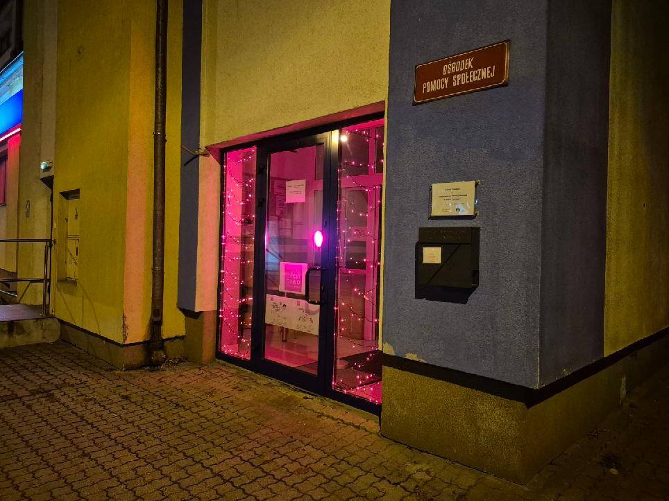 Od 17.00 drzwi wejściowe do budynku Ośrodka Pomocy Społecznej w Trzemesznie zostały podświetlone na czerwono.